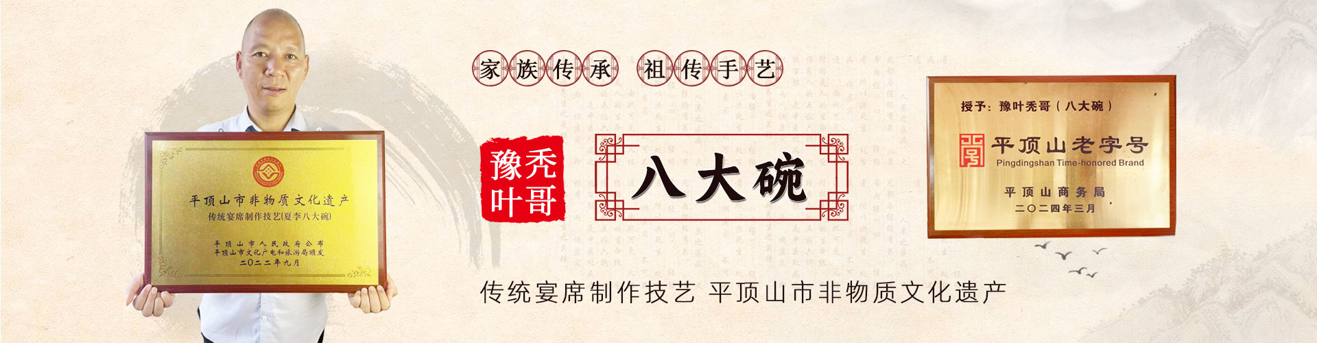 八大碗屬于民間傳統(tǒng)美食,在全國各地屢見不鮮。相傳洛陽八大碗始于唐代武則天年間 ,源于洛陽水席,流傳于清代乾隆年間河洛關(guān)中地區(qū)一代,至今已有600多年的歷史, 清同治年間高祖王大文在關(guān)中一代開一酒家,店里拿手菜便是這八大碗,因烹制口味獨(dú) 特、菜品實(shí)惠、為人善良、大氣實(shí)在、樸實(shí)好客而深受當(dāng)?shù)匕傩障矏鄣妹:笠蛲文?間關(guān)中回亂,連年戰(zhàn)亂不斷,高祖舉家遷至河南洛陽,到了祖父王祥這代,便回到老家 河南葉縣,歷經(jīng)160多年,傳承至今已有6代,禿哥八大碗榮獲平頂山市非物質(zhì)文化遺產(chǎn),平頂山老字號(hào)等榮譽(yù),創(chuàng)始人王金偉秉承先祖手藝! 得到祖父王祥的親傳,在先祖?zhèn)鹘y(tǒng)八大碗的基礎(chǔ)上,精心調(diào)制,用心選料,潛心研究, 因材施藝,運(yùn)用燉、燜、蒸、燒、炒、燴等烹飪方法結(jié)合綠色健康的飲食理念,創(chuàng)立豫葉禿哥品牌。在祖父王祥的基礎(chǔ)上,根據(jù)祖?zhèn)髅胤剑瞥隽硕d哥麻辣雞、禿哥五香牛肉、豫葉禿哥紅燒豬蹄、禿哥牛雜煲等產(chǎn)品,禿哥麻辣雞味道鮮辣,入口鮮麻,禿哥五香牛肉先腌后煮,慢火燉煮8小時(shí)!豫葉禿哥紅燒豬蹄爛而不散,肥而不膩,禿哥牛雜煲原味及香辣兩種口味可供選擇,豫葉禿哥系列產(chǎn)品,根據(jù)祖?zhèn)髅胤剑┮怨欧刂疲【x食材,加配30余種調(diào)味料!純手工燒制,看著誘人,吃著過癮!傳統(tǒng)方式烹飪,綠色健康的理念,深受廣大食客的歡迎。